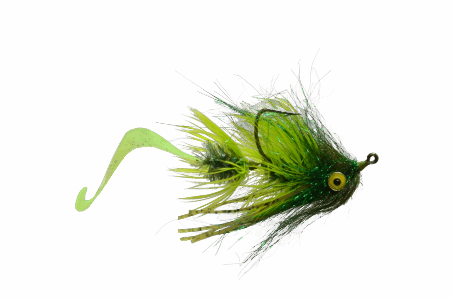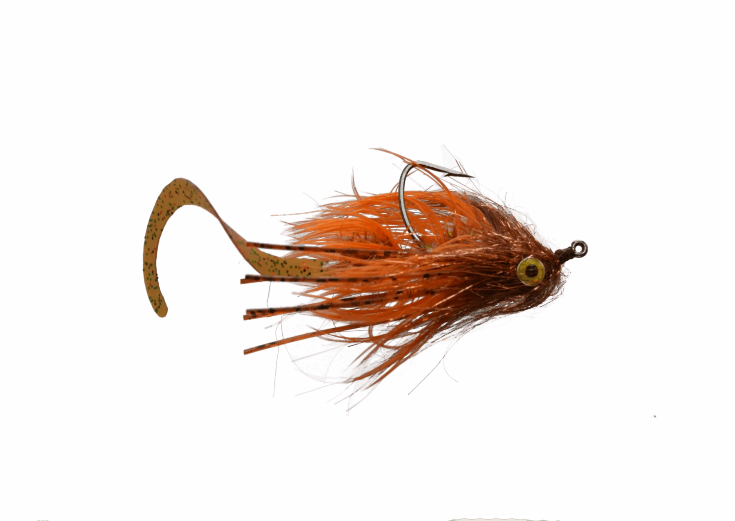 The Devil Dog is a great attractor fly pattern. Great for bass, trout, and even carp! It is tied with a barbell that will ensure the fly swims with the hook point up to avoid most snags in the water. The Body has a combination of hackle, metallic flash, and sili legs to give a lot of movement and attraction to this fly. And if that was not enough, there is a separate shank tied out the rear with a silicone fly tail attached. Not only will the fly tail pulsate in the water going back behind the fly, but with it being tied on a shank it can rotate 180 degrees in any direction giving the fly tail even more action. Changing direction on this fly can make it seem more alive than having a simple fly tail alone. It comes in 4 colors: black, white, orange, and chartreuse. The white and chartreuse are great general attractors while the orange is a great crayfish imitation and the black is a good imitation of a leech.
