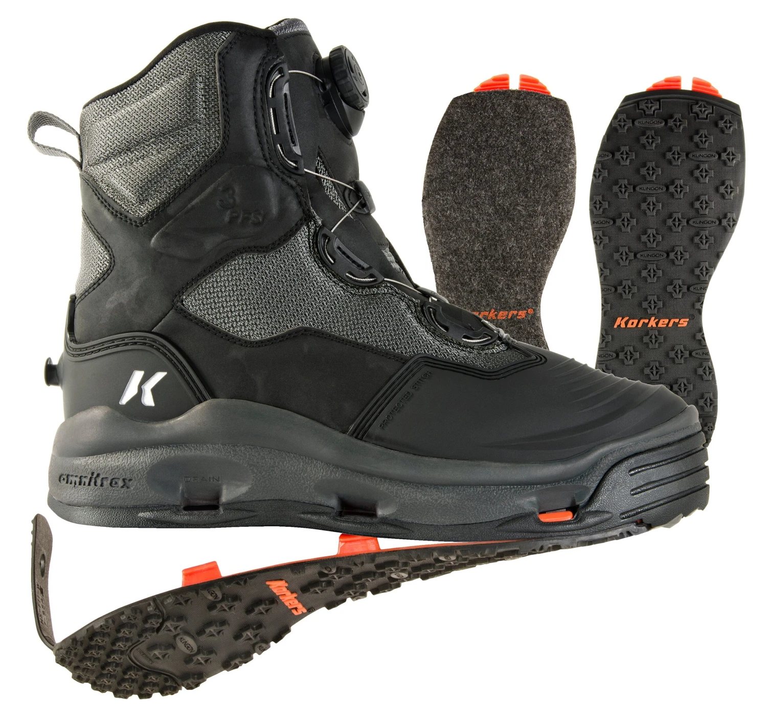 Traction: OmniTrax® Interchangeable Sole System adapts your traction to any fishing condition.
