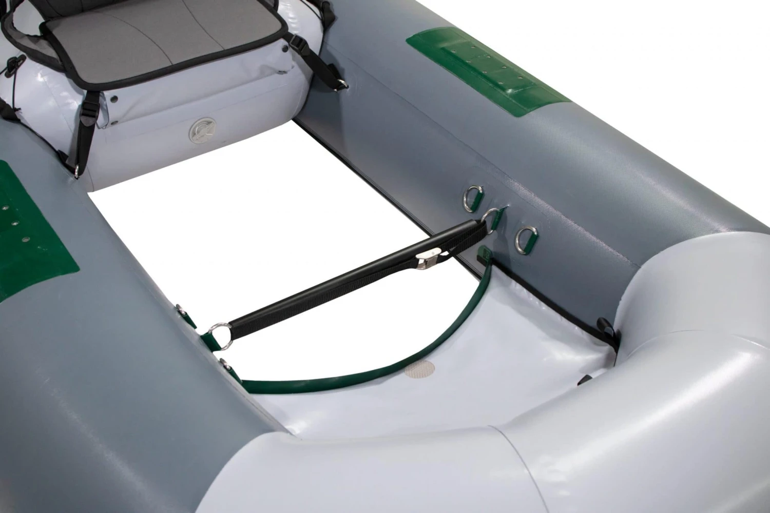 The OSG Clearwater is ready for big water and lots of gear. Using the open oarlock system, perfected on some of our multi-person rafts, it can accommodate longer/stronger oars for conditions when you need to put more oomph into your stroke. The Clearwater has a trampoline style cargo space in front and back for securing lots of gear. It has a 450lbs load capacity but weighs in at just under 35lbs. The high-back seat rests on an inflatable thwart so the rower has great visibility and making it great for longer days on the water and even short expedition trips. Bonus, no trailer is needed and will fit in the bed of pick-up or can be car-topped for easy transport to your next fishing spot.
