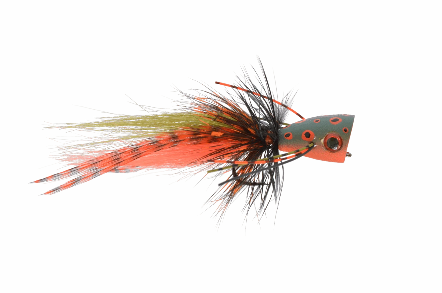 You could use a 5# rod it’s so light! The foam head is made of durable 60# density closed-cell Rainy’s foam for optimal buoyancy and durability. It also has 3 colors of complimentary barred rubber legs coming out each side to give the fly more movement as it is stripped or popped in the water. This is a great imitation of frogs, salamanders, sliders, and other swimming critters that bass, pike, and even trout cannot avoid the temptation of.  Available in olive with orange belly and green with white belly.